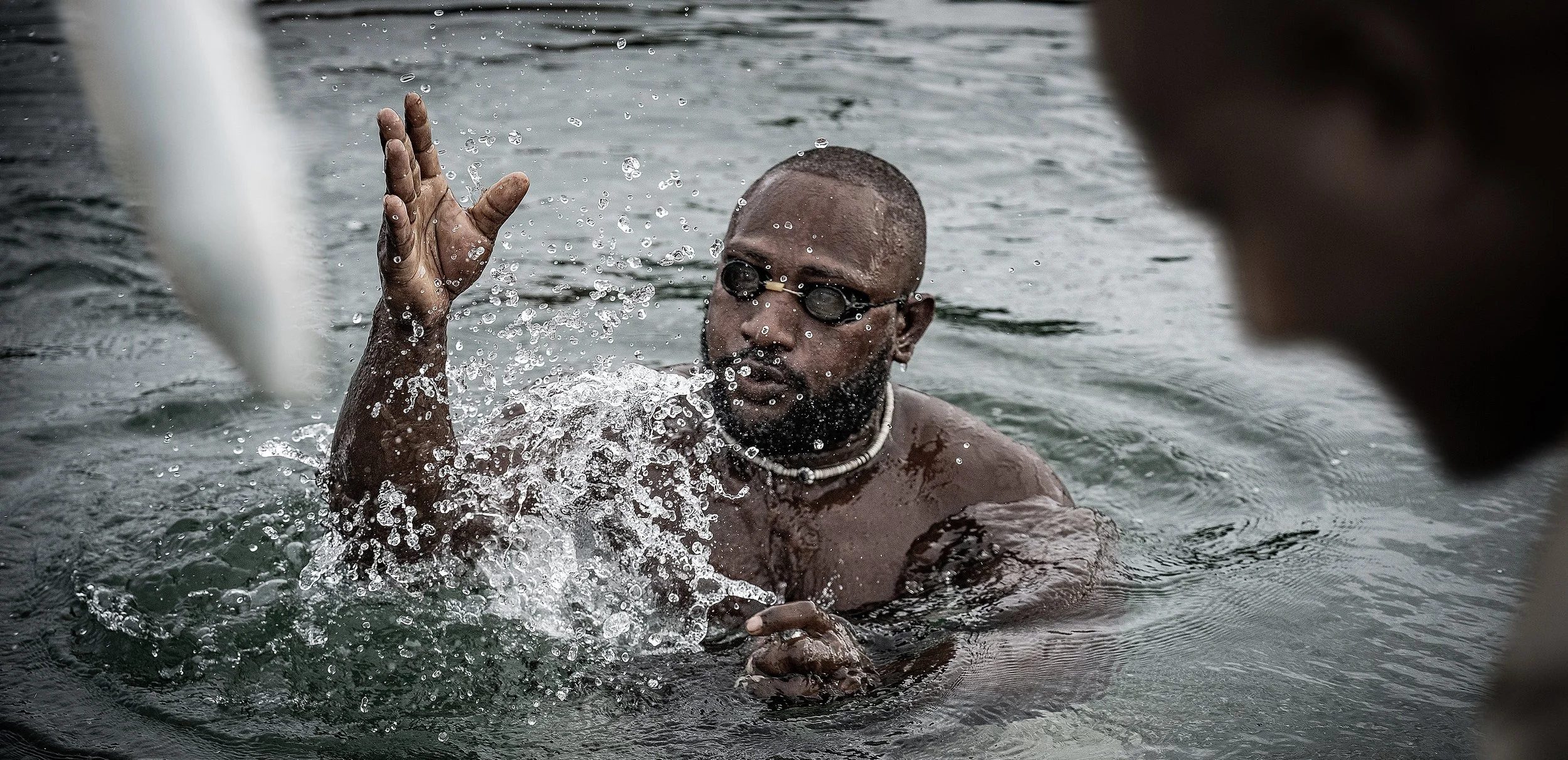 Roughly 90 nautical kilometres north, in Suava Bay, another group of fishermen from Adaitolo village gathers before sunrise. Led by community elder David Amagela, 65, they steer their handmade canoes toward ripples on the water. Two canoes cast a large circular net, while others slap the water with sticks, driving fish into the net. Divers jump in, grabbing the fish trapped inside.